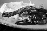 Italian food. Fried quail with sweet potato puree with berry sauce. Serving dishes in a restaurant in a blue plate. background image, copy space text
