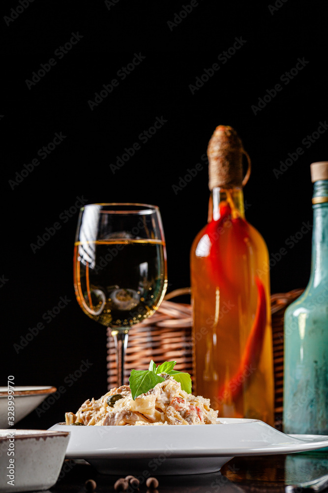 Spanish cuisine. Pasta in cheese sauce with canned tuna fish, cherry tomatoes and parmesan and basil. Dishes in a restaurant in a white plate. background image, copy space text
