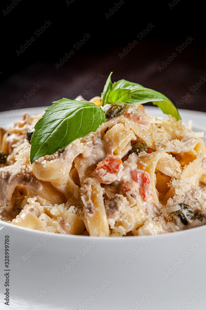 Spanish cuisine. Pasta in cheese sauce with canned tuna fish, cherry tomatoes and parmesan and basil. Dishes in a restaurant in a white plate. background image, copy space text