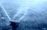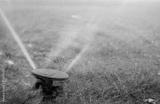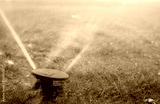 Automatic lawn sprinkler watering green grass. Garden, yard irrigation system watering lawn. Water saving or conservation from sprinkler system. Turf farm business. Sprinkler service and maintenance.