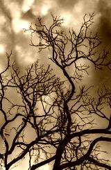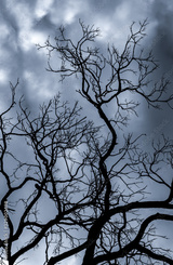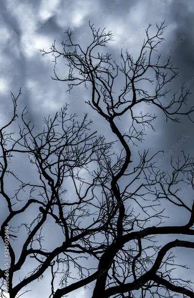 Silhouette dead tree on dark dramatic sky and white clouds background for death and peace. Halloween day background. Despair and hopeless concept. Sad of nature. Death and sad emotion background.