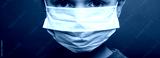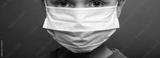 Face of a mask-wearing boy with fear in the eye Close-up on a gray background.