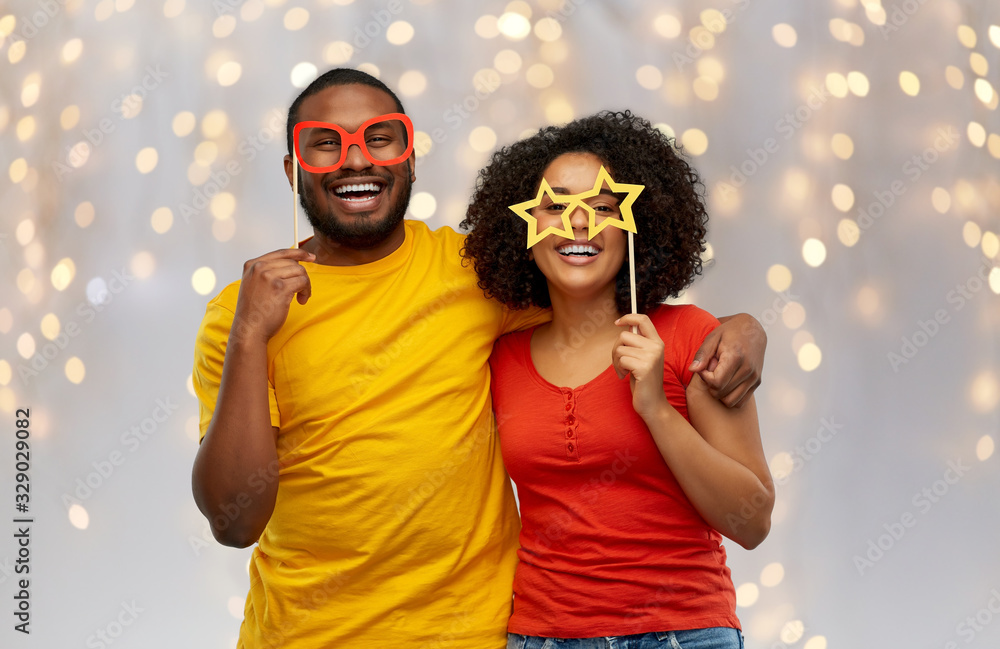 holidays, photo booth and people concept - happy african american couple with party props hugging over festive lights background