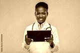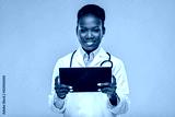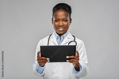 medicine, technology and healthcare concept - happy smiling african american female doctor or in white coat with tablet pc computer and stethoscope over background