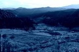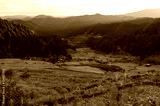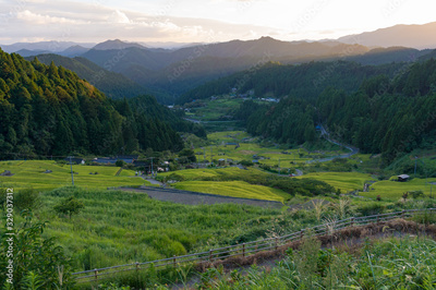 Mountain landscape with rice terraces at sunset. Japanese countryside