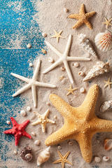 Seashell, starfish and beach sand on blue wooden background. Summer holiday concept. Top view.
