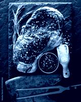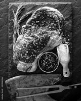 Marbling ribeye steak on black plate. Prime rib beef chop