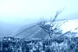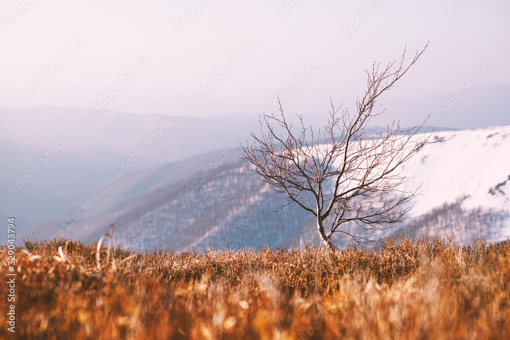 Spring snowy hills with naked tree and red blueberry bushs in Carpathian mountains. Landscape photography