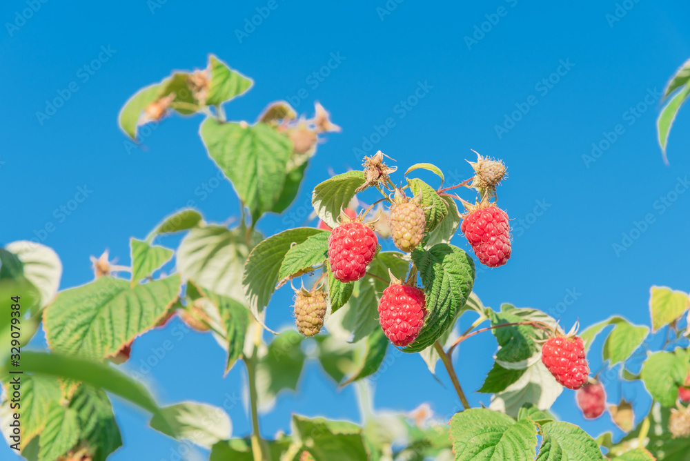 Lookup view ripe raspberries on tree branches in clear blue sky in Washington, USA