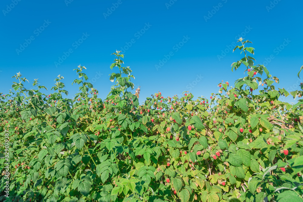 Bounty ripen raspberries bush with clear blue sky in Washington, USA