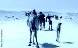 a caravan of camels making their way through the desert, naturally and instinctually navigating through the dunes