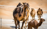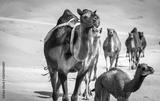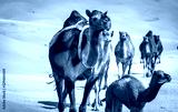 a caravan of camels making their way through the desert, naturally and instinctually navigating through the dunes