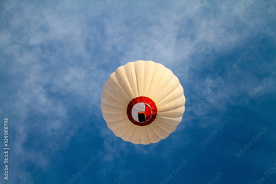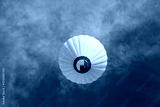 A white balloon high in the sky. There is a blue sky with a white balloon. view from below.