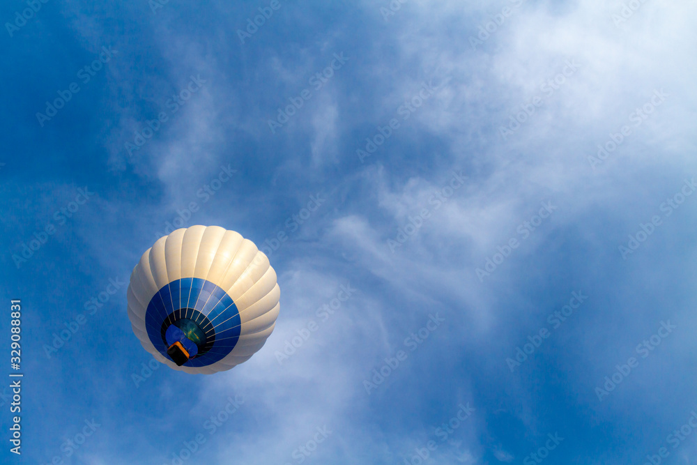 A white-blue balloon high in the sky. There is a blue sky with a white balloon. view from below.