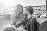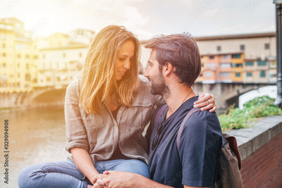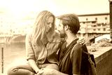 Young couple in love embraces each other in front of Ponte Vecchio in Florence at sunset - Millennial having fun together - Honeymoon in a famous Italian city