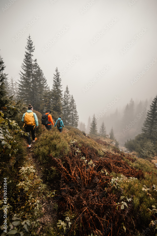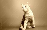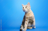 Gray tabby cat on a blue background looks up. Animal portrait. Pet. Sitting posing. Beautiful funny kitten.