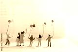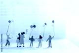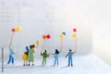 Business, Money, Finance and Family Concept. Group of children and kid miniature figure people with colorful balloon standing on bank passbook with copy space.