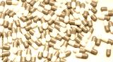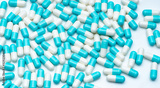 Blue and white capsule pills on white background. Pharmaceutical industry. Blue pastel color capsule pills spread on white table. Pharmaceutics background. Healthcare and medicine. Pharmacy products.