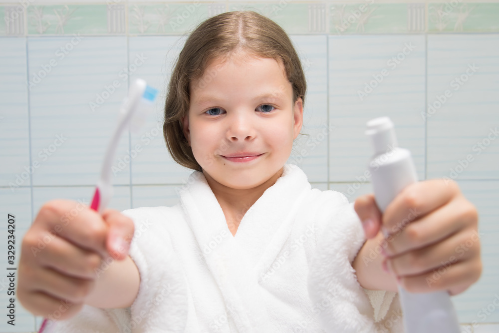close-up, a cheerful girl in a white coat, holding a toothbrush and toothpaste, straightening her hands