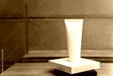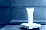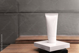Empty treatment facial skincare white tube product with a blank label bottle sitting on white and black square pedestal with copy space and plain grey wall minimal and loft style as a background.