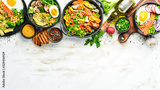 Assortment of food on white wooden background. Seafood, meat and vegetables.