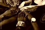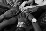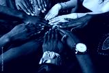 Hands of happy group of multinational African, latin american and european people which stay together in circle
