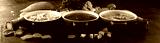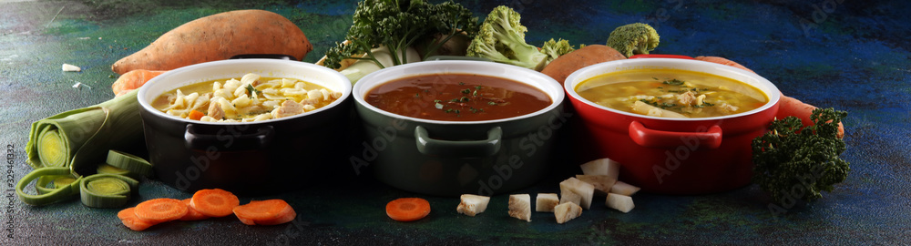 Set of soups from worldwide cuisines, healthy food. Broth with noodles, beef soup and broth with marrow dumplings. All soups with healthy vegetables on table