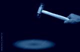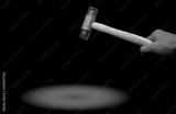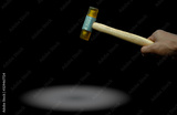 Man's hand holding plastic hammer isolated on dark background. Male worker's hand hold wood handle of plastic hammer. Hammer head made of soft and tough yellow plastic that not damage workpiece.