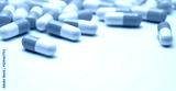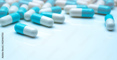 Selective focus on blue-white capsule pills. Capsule pills sperad on white background. Pharmaceutical industry. Pharmaceutics. Health and medicine concept. Pharmacy products. Drugs in hospital.