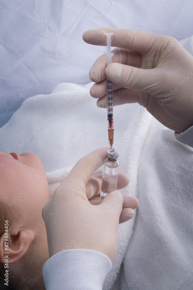 doctor in protective gloves, typing in a syringe, a drug for injection, against the background of the patient