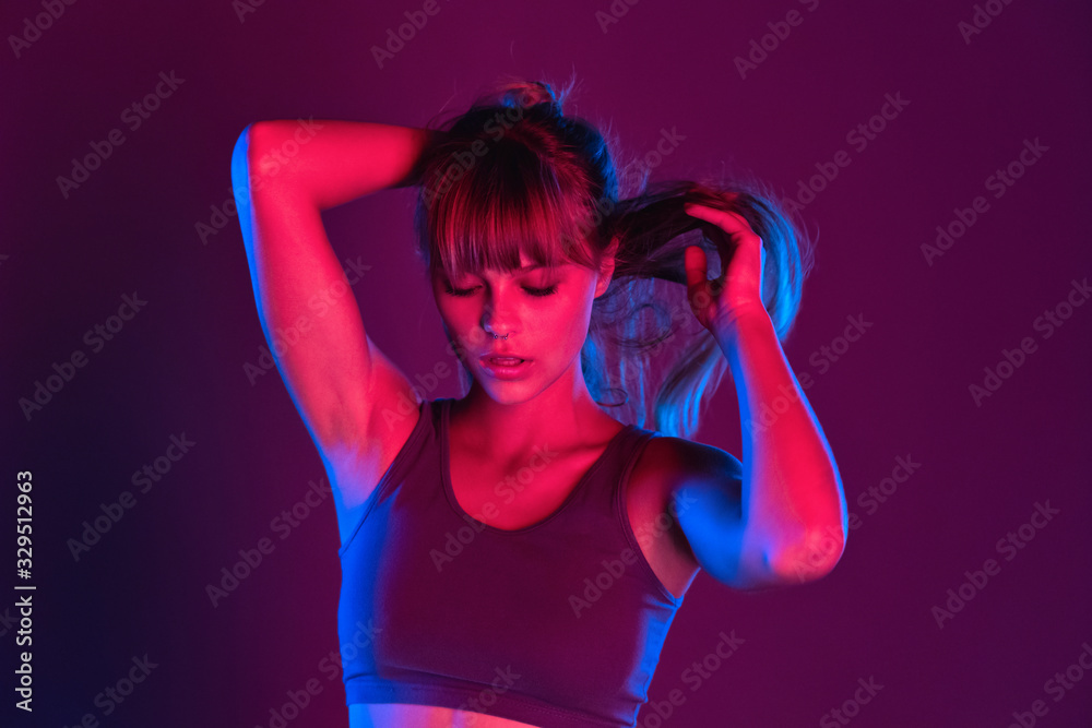 Sexy sensual fashion attractive young 20s girl model beautiful blond hair at purple studio background, hot trendy stylish woman beauty face stand in neon blue party night club light concept.