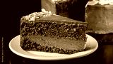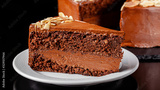 Modern pastry. Chocolate cake with nuts, almonds and peanut butter. Cake on a black background. background image, copy space text