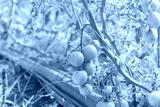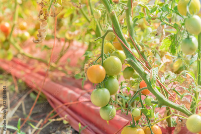 Ripe and green tomatoes branches on string trellis at farm in Washington, USA