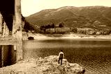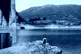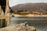 Stylish man watching wonderful scenery in mountains during spring time in Italy. Young white caucasian man standing in front of mountain and lake landscape near grande bridge.