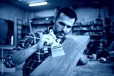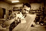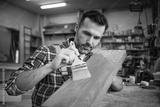 Craftsman applies varnish on wooden board by paintbrush in his carpentry workshop