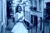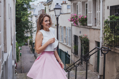 photoshoot in Paris in Montmartre, portrait of young smiling woman model looking at camera
