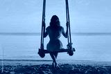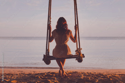 beach travel destination, silhouette of beautiful woman sitting on rope swing, serenity, summer holidays