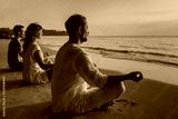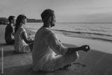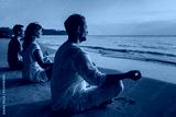 group meditation, people practicing yoga on the beach, relaxation and breathing excercises