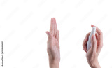 Woman hand hold alcohol bottle and spray on palm to protect and kill coronavirus and cleaning hand. Personal hygiene to prevent coronavirus or flu epidemic. Cleaning hands from germs, virus, bacteria.