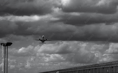 Black and white scene of airplane landing at the airport. Commercial airline flying on dark sky and white clouds over fence and lamp post. Aviation business crisis concept. Journey vacation flight.