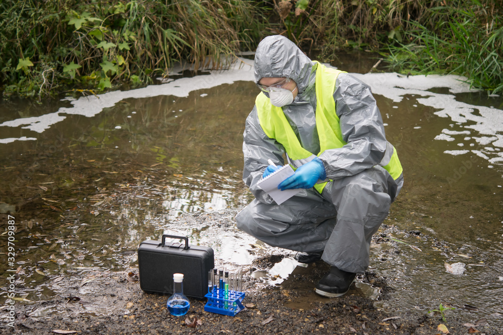 the scientist, wearing a protective suit and mask, took the liquid from the river, in test tubes, and writes the results in a notebook