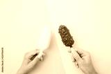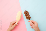 Young couple hands holding together ice creams with dark and white chocolate glaze. Closeup. Point of view shot. Light pink and blue table background. Pastel colors. Top down view.
