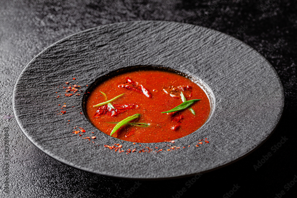 Spanish cuisine. Modern cream gazpacho soup made of tomatoes, sun-dried tomatoes and basil in a black ceramic plate. Dish on a black background. background image, copy space text