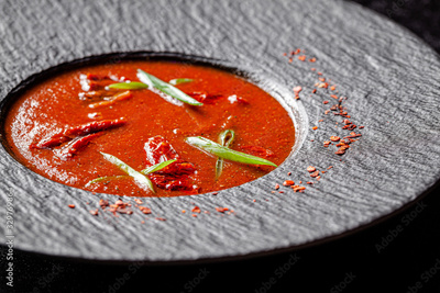 Spanish cuisine. Modern cream gazpacho soup made of tomatoes, sun-dried tomatoes and basil in a black ceramic plate. Dish on a black background. background image, copy space text