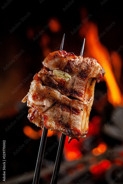 American cuisine. Fried pork ribs with honesty, chopped on a fork against a fire. The cook holds a fork in his hand. background image, copy space text