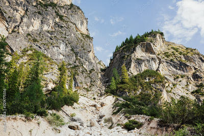 Italy, Lago di Braies, Dolomites alps. Beautiful nature, high mountains around, sunny weather. Concept of nature and tourism.