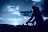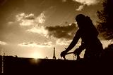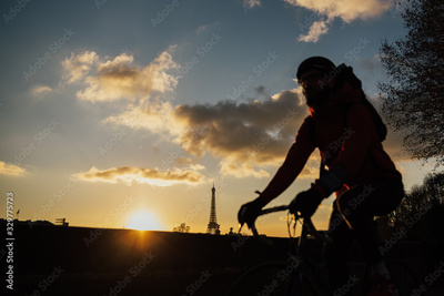 Man cycling through Parisian streets in sunset - abstract motion blur shot. Man on a bike riding with Eiffel tower on background.