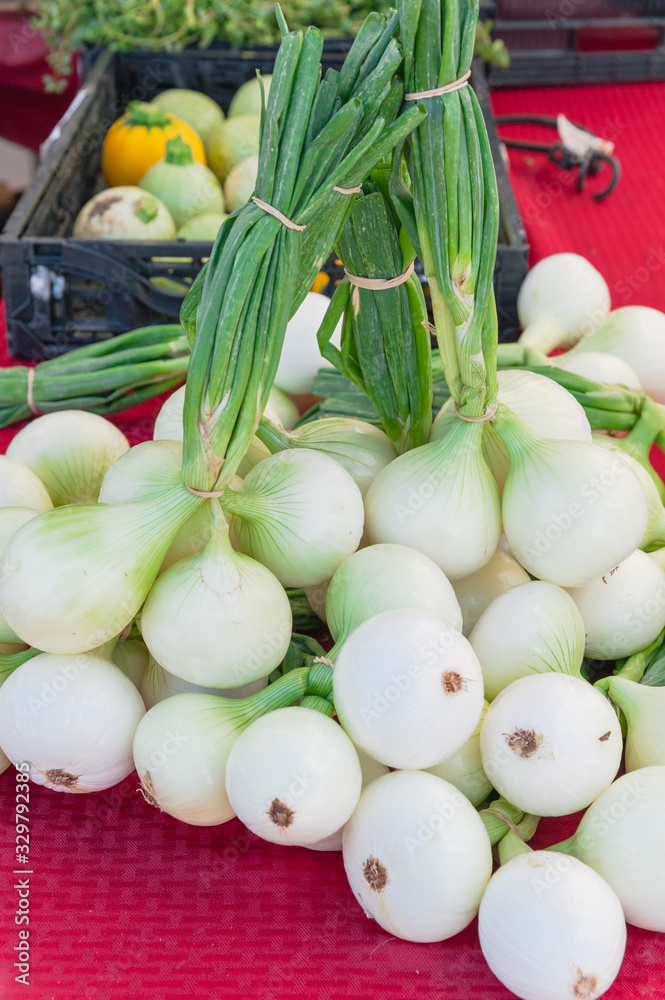 Organic sweet onion bunches with blurry squash crate background at market stand in Washington, USA