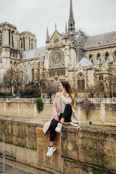 Happy stylish girl having fun near Notre-Dame cathedral in Paris, France. Tourist enjoying their vacation in France. Young smiling woman tourist sitting in front of the famous Notre Dame cathedral.