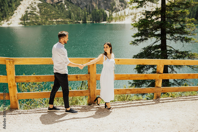 Follow me on beautiful landscape of Braies Lake (Lago di Braies), romantic place in the Alps Mountains, Dolomites, Italy, Europe. Beautiful couple on a wonderful lake and mountains amazing view.